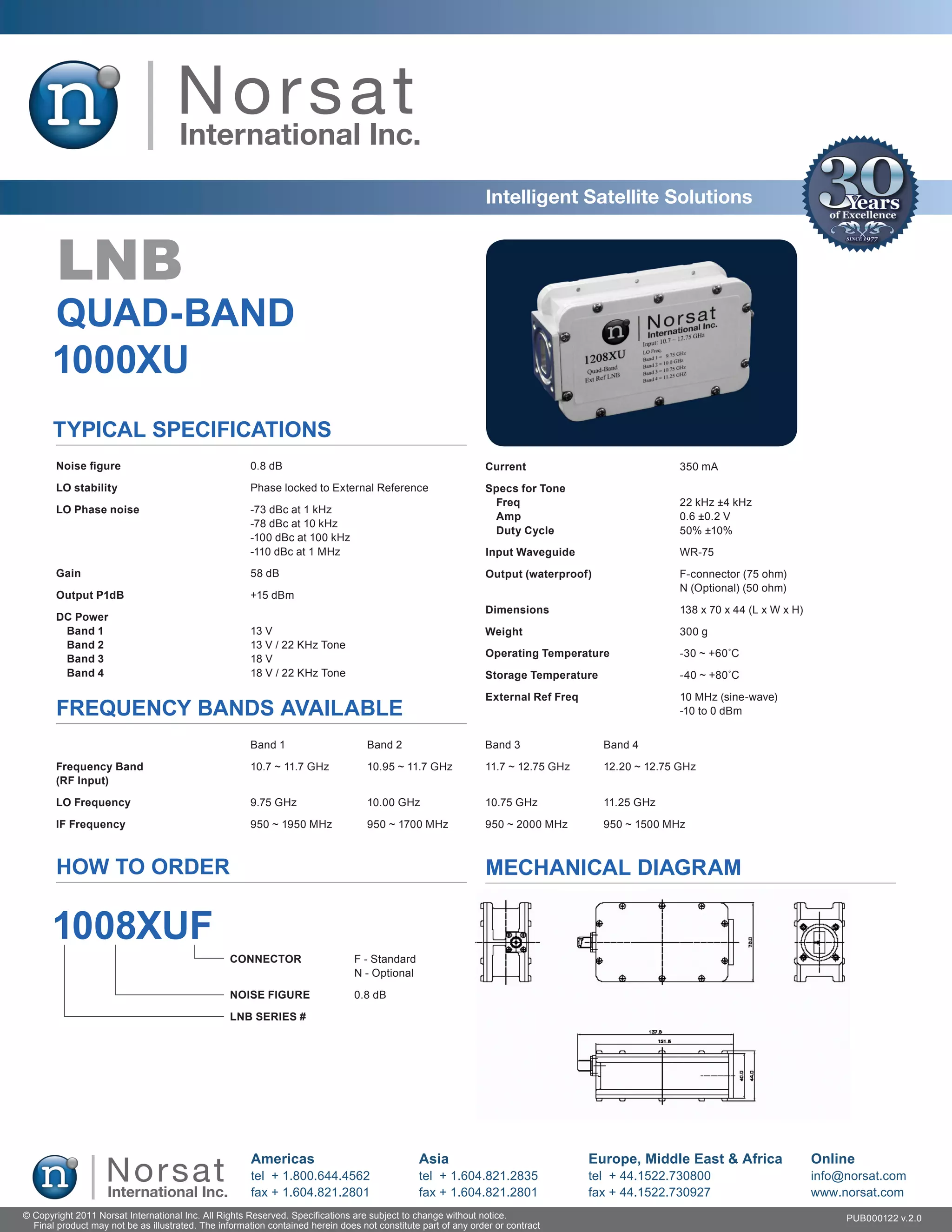 This document provides specifications for the LNB QUAD-BAND 1000XU satellite solution from Norsat International. It includes technical specifications for the noise figure, gain, output power, frequency bands, dimensions, and operating parameters. Customers can order the 1000XU by selecting the frequency band and connector options. The document also includes a diagram of the mechanical dimensions.