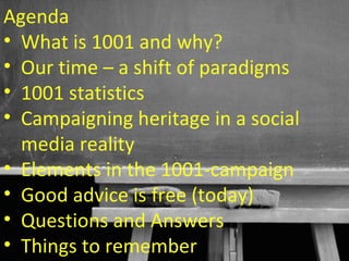 The document summarizes a presentation about the 1001 Stories website, which allows users to share stories and pictures about cultural heritage sites in Denmark. Some key points: