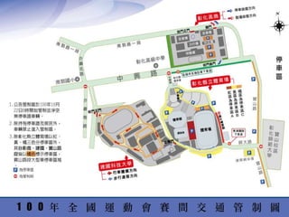 本文件是有關於第100屆全國運動會的行前會議報告,列出了比賽日期、競賽類別及場地等安排,包括田徑、游泳、籃球等項目。文中也提及了選手報到、開幕活動及相關注意事項,如代金領取與住宿安排。整體活動將於100年10月22日至10月27日舉行。