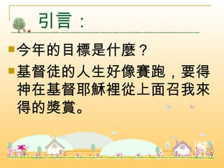 引言: 今年的目標是什麼? 基督徒的人生好像賽跑,要得