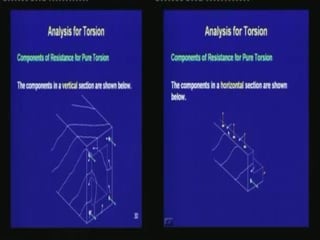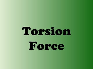 This document discusses torsion force and its importance in pre-stressed concrete lab courses. It defines torsion force as a twisting force applied to an object by twisting one end. The document outlines objectives about defining torsion force, explaining formulas, and discussing its importance in pre-stressing. Key concepts covered include the torsion formula for solid and hollow circular cross-sections, limitations of the equations, origins of torsion theory, reasons for understanding torsion in pre-stressed concrete, analyzing torsion, and defining pure torsion.