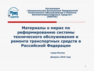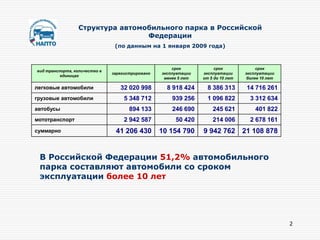 Документ представляет анализ состояния и структуры технического обслуживания и ремонта транспортных средств в России на 2009 год, включая данные по возрасту и техническому состоянию автомобильного парка. Выявлены проблемы с качеством обслуживания и недостатком предприятий в данной сфере, что создает инфраструктурные ограничения для автомобильного рынка. Также предложены меры по реформированию системы и поддержке отрасли, включая улучшение подготовки специалистов и координацию действий ведомств.