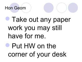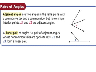 This document contains a geometry lesson plan covering key terms, vocabulary, postulates, and theorems in geometry. It includes objectives to define terms like angle, vertex, straight angle, and angle addition postulate. It also covers measuring angles using a protractor and identifying coplanar points. Worked examples are provided to illustrate concepts like finding lengths using the segment addition postulate and classifying angles as acute, right, or obtuse.