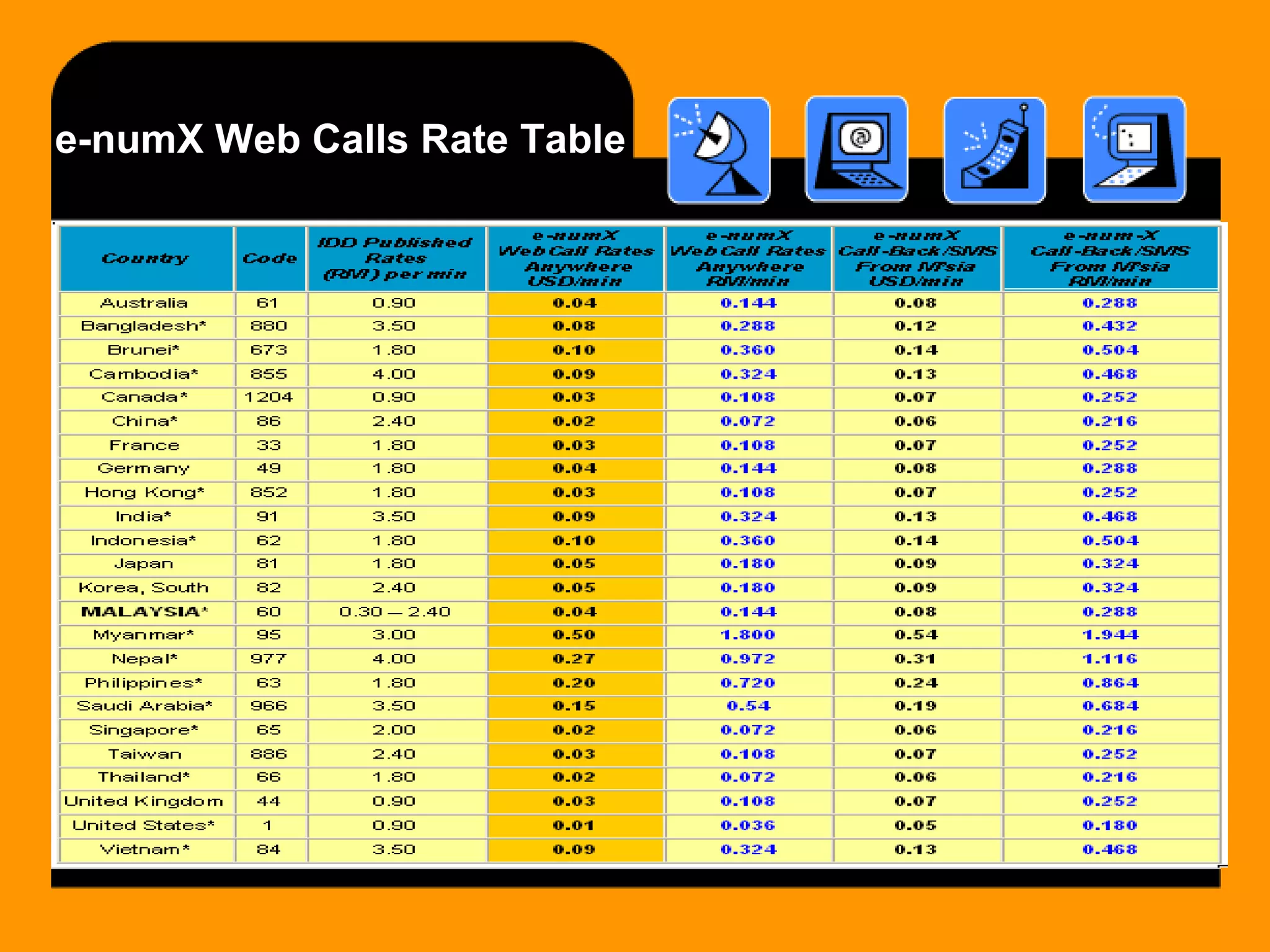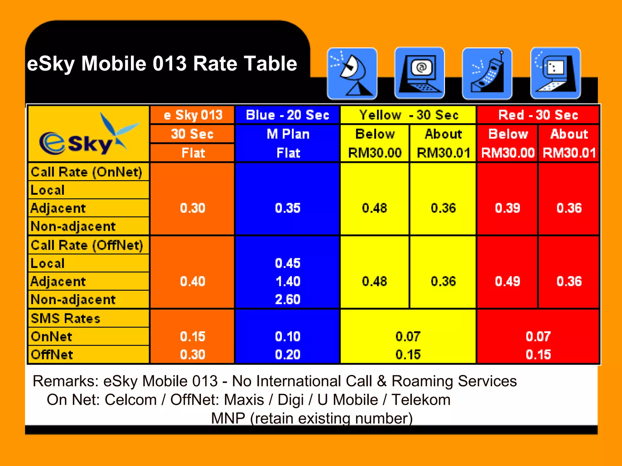 eSky Mobile 013 is a mobile plan that does not offer international calls or roaming. It allows calls within Celcom's network and between Celcom, Maxis, Digi, U Mobile, and Telekom networks. The plan supports number portability. The document provides the rate table for e-numX Web Calls, noting rates are the same for calls to mobile phones in listed countries and apply 24/7 including holidays. Rates for missed/SMS call backs include charges for both the originating and destination countries. All 888 numbers within the same country are free. Prices and rates may change without notice.
