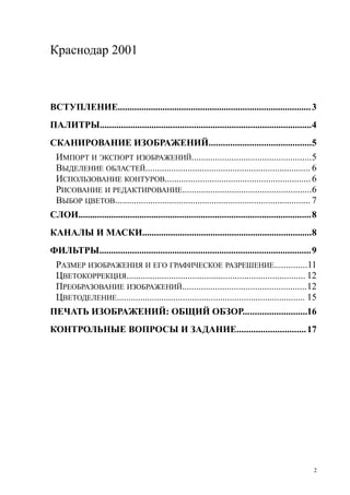 Реферат описывает программу Adobe Photoshop, ее функции и возможности, включая работу с палитрами, сканирование изображений, импорт и экспорт файлов, выделение областей, использование контуров, рисование и редактирование. Программа предоставляет пользователям множество инструментов для обработки изображений, включая метки по цветам и управление слоями. В документе также рассматриваются основные аспекты работы с цветами и каналами, а также предлагаются контрольные вопросы для закрепления материала.