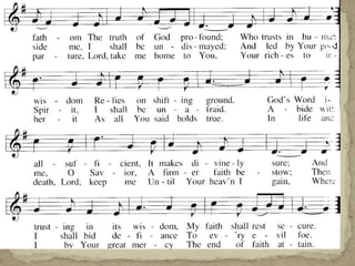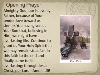 This document provides scripture passages and summaries related to the topic of faith alone or sola fide. It begins with passages that describe faith or belief in God/Jesus leading to salvation, victory over sin, and eternal life. It then discusses obstacles, tests, weaknesses of faith and warnings against unbelief. Next it outlines aids to strengthening faith such as God's promises and works, the Bible, and asking God for wisdom. Finally it presents defenses of faith and admonitions to have courageous faith in God. The overall document examines faith from several angles to provide a thorough biblical perspective on the doctrine of sola fide.
