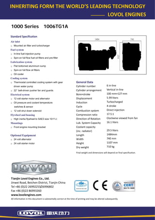 The document outlines the specifications and performance features of Lovol engines, including high power density, low fuel consumption, and easy maintenance. It details the engine's capabilities at various power outputs and operating temperatures, along with its cooling and lubrication systems. The information is intended as a technical guide for potential users and may be subject to change.