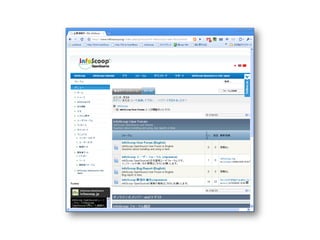 Japan について 1. infoScoop Opensource Club Japanの設立とその目的 2010年4月12日に企業向け情報ポータルソフトウェアinfoScoop OpenSourceを利用する企業、団体、個人の交流、情報交換と、 infoScoop OpenSourceの普及を目的として設立されました。 2. 入会資格 IOCJの趣旨に賛同し入会を望む個人・企業・その他の団体は、所定の手 続きを踏むことでどなたでも会員となることが可能です。 3. 活動内容 infoScoop OpenSourceの普及活動 infoScoop OpenSourceの利用・開発のアドバイス 会員相互のコミュニティサイトの開設と運営 会員相互および外部との人的交流及び技術交流 会員相互および外部との交流を目的としたイベントの企画と運営・開催