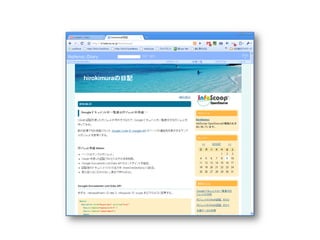 ①今後のIOCJイベントについて ②こんな使い方をしています:凸版印刷野内様 ③infoScoop OpenSourceの新機能のご紹介 発表および各種機能についてのディスカッション ④ビーコンITの取り組みのご紹介 Enterprise Front-end Integrationについて ⑤懇親会