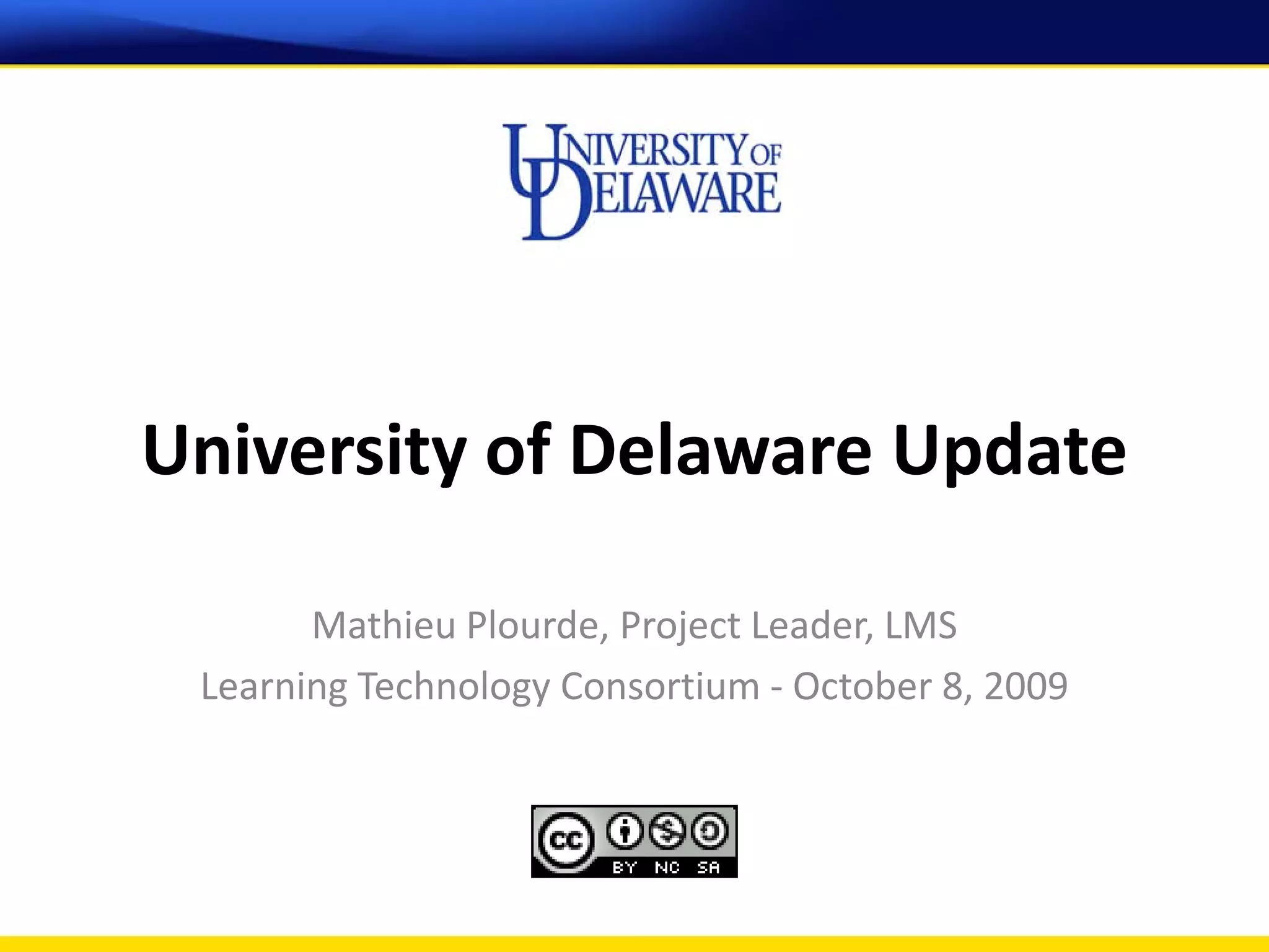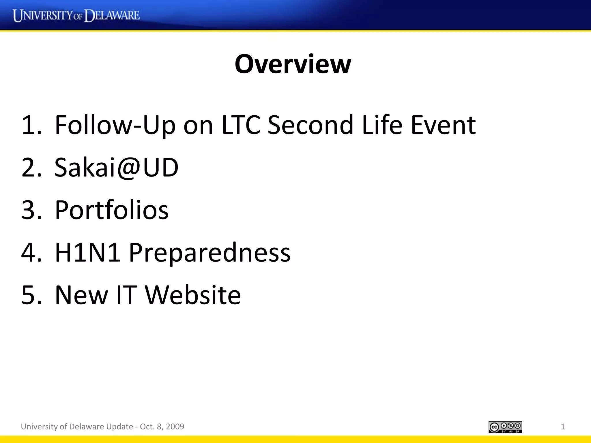 The document provides an update from the University of Delaware. It discusses the follow up from an LTC conference held in Second Life, the adoption of the Sakai learning management system, development of e-portfolios, H1N1 preparedness strategies involving technology and pedagogy, and the launch of a new IT website.