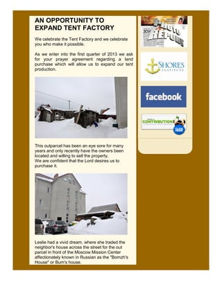 The document summarizes plans to expand a tent factory in Moscow to produce more gospel tents for evangelism across Eurasia. It discusses purchasing a neighboring property to enable expansion, describing a dream the director had about acquiring the land. Over $60,000 has already been pledged toward the $85,000 goal to purchase the property. The tents provide places for salvation and miracles, and have helped train preachers who start new ministries across the region. Supporters can receive artwork in exchange for monthly or one-time financial commitments to help fund a new initiative in India.
