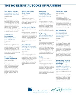 This document provides summaries of 18 influential books related to the development of urban planning as a field from 1909 to 1962. It describes the key ideas and impacts of each book, including foundational works on city planning techniques, the rise of suburbs, new conceptual approaches to urban design, and the growth of planning as a professional discipline and area of academic study. Many of the books discussed still shape planning practice and thinking today.