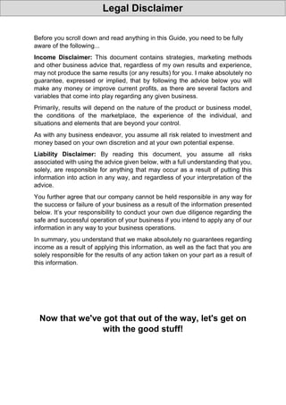 This document provides strategies for making $100 per day online using free traffic methods. It discusses using viral mailers, traffic exchanges, and link building to generate traffic to money-making opportunities. Specific programs and sites are recommended for getting started easily and earning commissions. Disclaimers are included about income not being guaranteed and the reader taking full responsibility for their business results.
