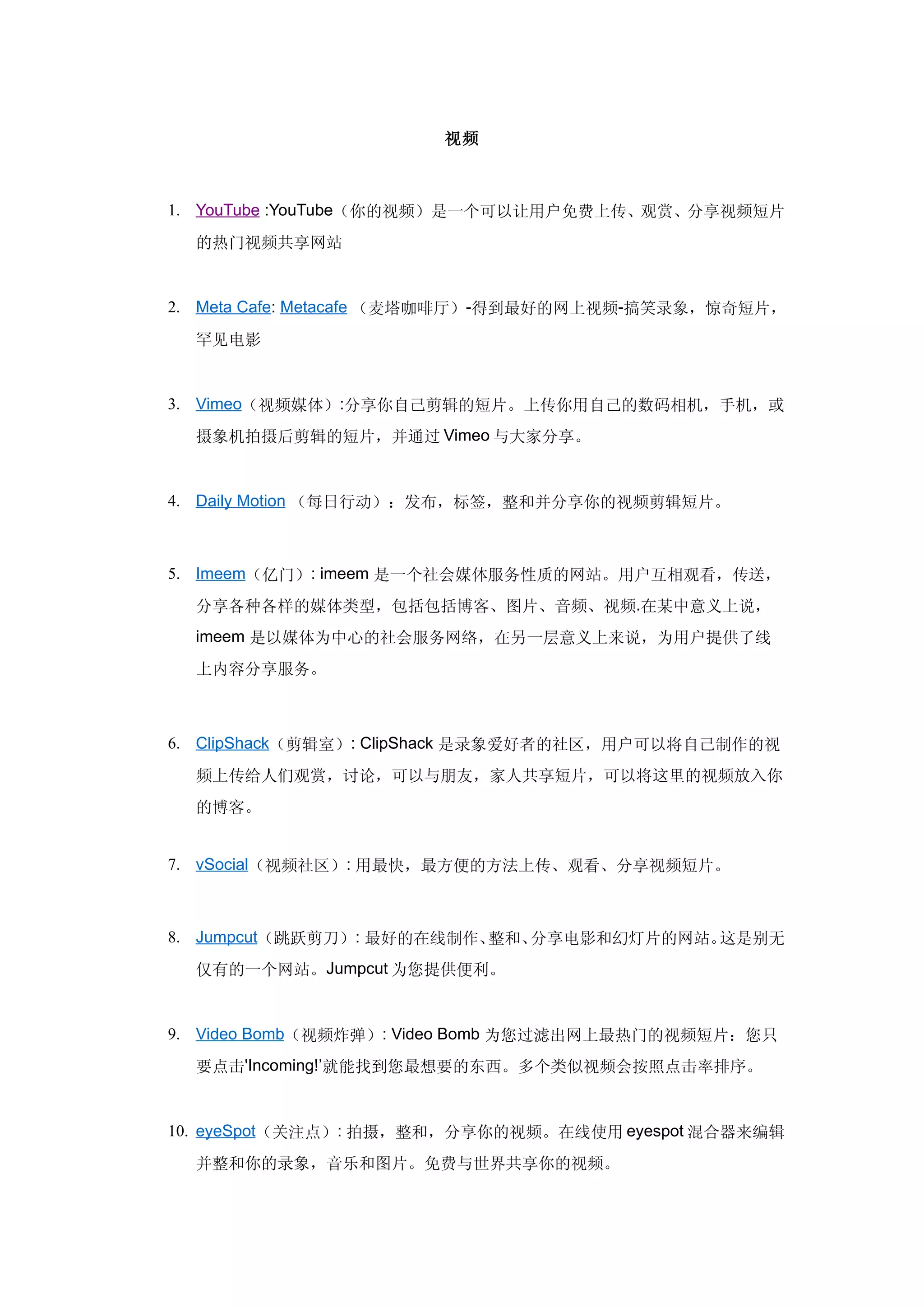 该文档列出了多种在线服务和平台,涉及视频分享、音乐发现、通信工具、图片存储、博客、书签管理、VOIP、游戏、维基百科、办公工具、RSS服务、电子邮件、新闻和文件共享等各个领域。每个服务的简要描述说明了其主要功能和特点,让用户能够找到适合自己需求的工具。整体内容提供了有关网络服务的广泛视角,展现了数字化生活的多样性。