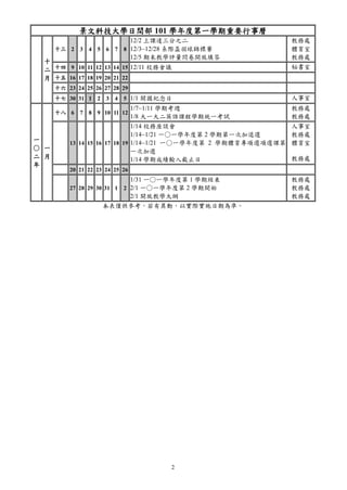 景文科技大学日间部的101学年度重要行事历涵盖了新生报到、期中考以及各类体育赛事等重要活动和时间安排。日历详细列出了时间节点和主办单位,以便学生和教职员工参考及参与。整个文档为确保学期顺利进行提供了重要的时间框架。