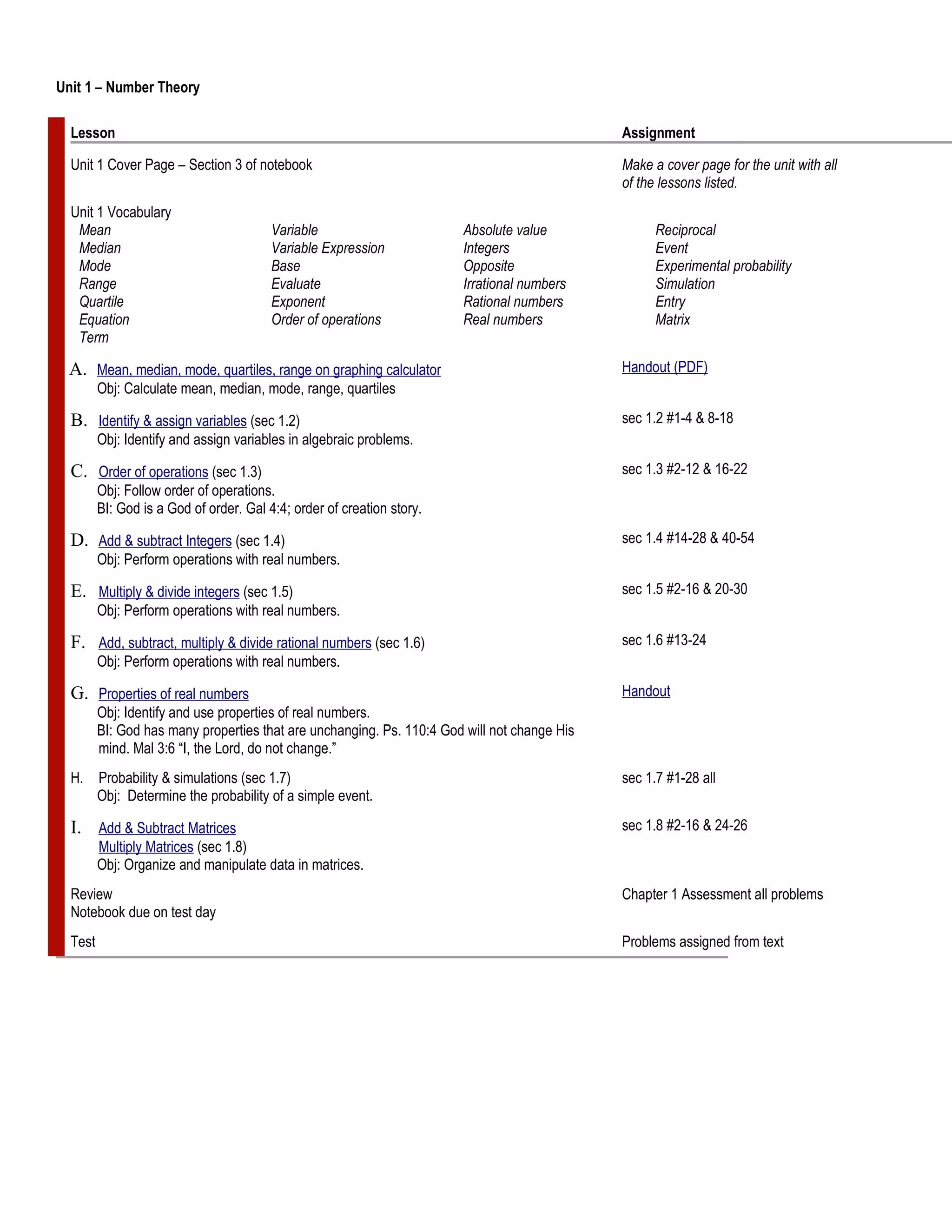 - Unit 1 covers number theory including operations with integers, rational numbers, and matrices. Assignments involve calculating mean, median, mode as well as following order of operations.