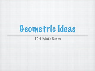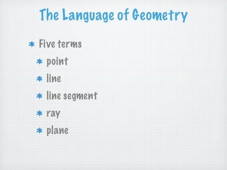 The document defines and provides examples of five basic geometric terms: point, line, line segment, ray, and plane. It explains that a point denotes a specific location in space, a line consists of points forming a continuous straight path, a line segment is part of a line between two endpoints, a ray has one endpoint and extends indefinitely in one direction, and a plane is a flat surface defined by any three non-collinear points. Examples are given to illustrate each term and how they are symbolized.