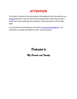 This document provides 87 tips for using Google more effectively by leveraging advanced search features and operators. Some key tips include using Boolean operators like AND, OR, and NOT to refine searches, using modifiers like intitle, inurl, and site: to search specific fields or sites, and taking advantage of Google's built-in tools for calculations, conversions, definitions and more. The document encourages users to create a Google account to access additional personalized features and customization options.