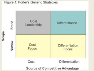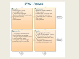 This document provides an overview of strategic leadership and management skills. It discusses strategy as long-term decisions that add value, and examines reasons for studying strategy as well as how managers develop strategies. Key tools for analysis include SWOT analysis, value chain analysis, and identifying opportunities. Strategies can exist at the corporate and business unit levels. The document also explores implementing and evaluating strategies.