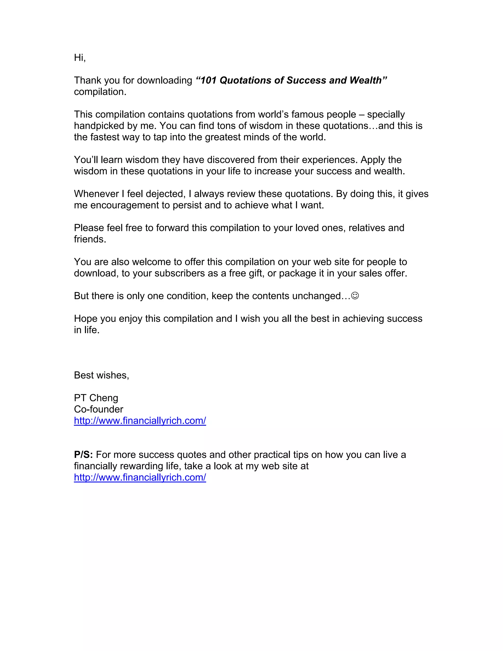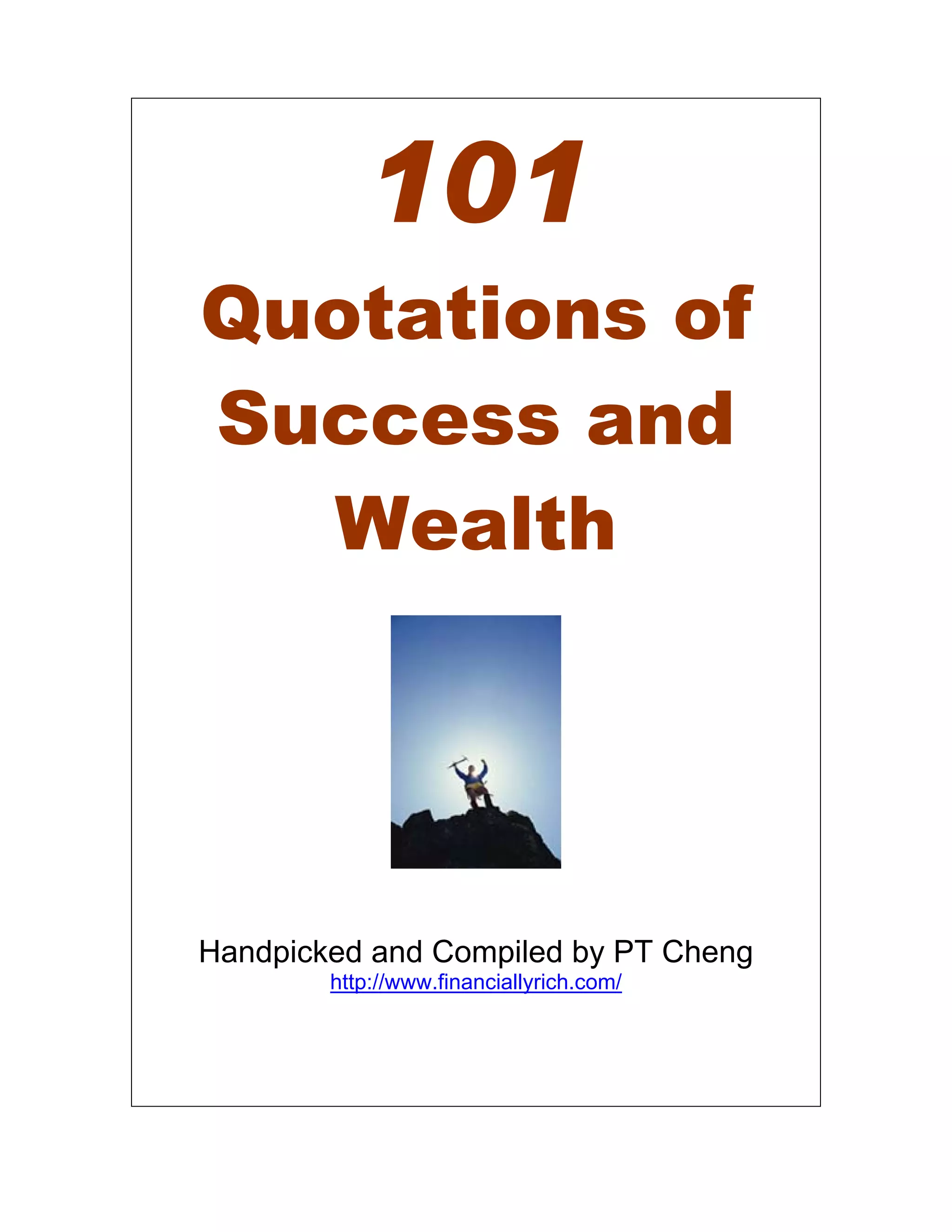 This document is a compilation of 101 quotations about success and wealth compiled by PT Cheng. It contains wisdom from famous people on topics like ambition, perseverance, risk-taking, and overcoming obstacles. The compiler collected these quotes to help readers increase their success and wealth by applying the lessons learned. He encourages sharing the compilation freely and using it as inspiration during difficult times.