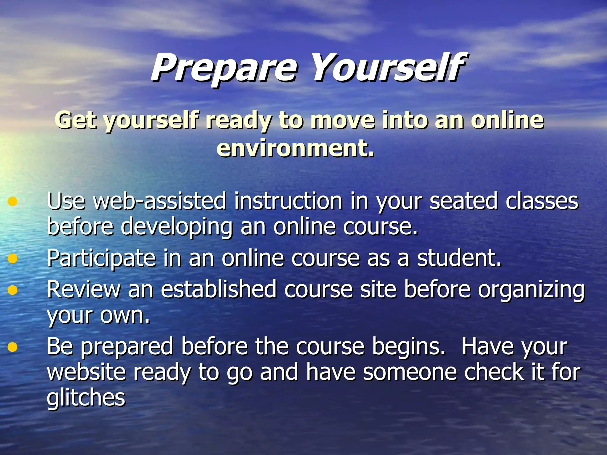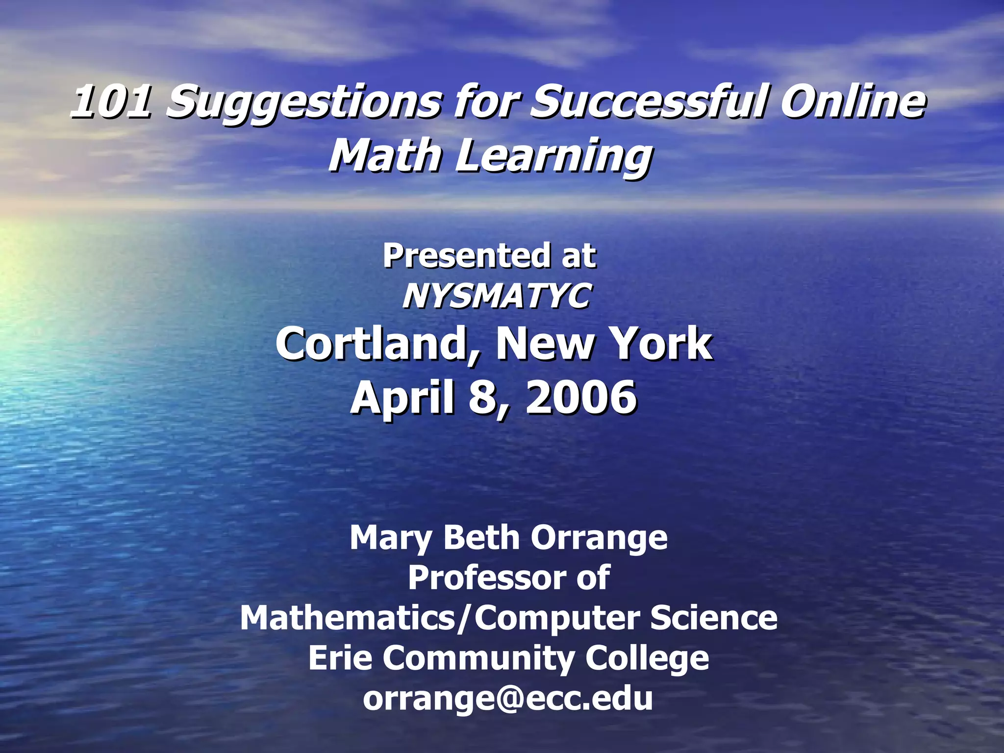 This document provides 101 suggestions for successful online math learning organized into sections on preparing for the course, course design techniques, course organization, testing and grading, communicating with students, and general advice. Some key suggestions include using web tools in seated classes first, making the website simple to navigate, stating clear goals and objectives, engaging students with a variety of tools like discussions and projects, providing quick feedback and frequent assessments, and orienting students to the online environment.