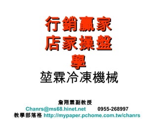 行銷贏家行銷贏家 店家操盤店家操盤 學學 詹翔霖副教授 Chanrs@ms68.hinet.net 0955-268997 教學部落格 http://mypaper.pchome.com.tw/chanrs 堃霖冷凍機械