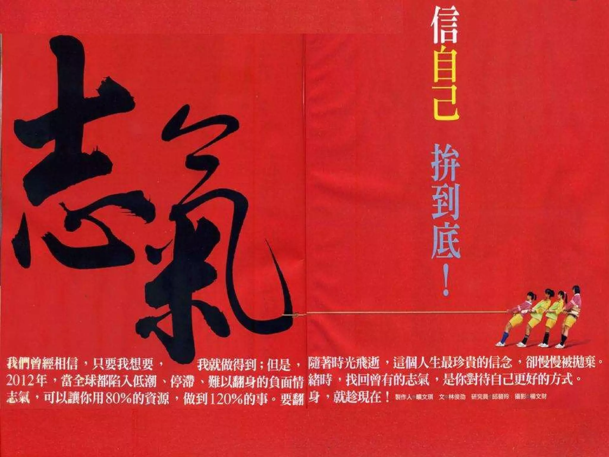 今年找回你最珍貴的力量-志氣 我們曾經相信,只要我想要,我就做得到;但是,隨著時光飛逝,這個人生最珍貴的信念,卻慢慢被抛棄。2012年,當全球都陷入低潮、停滯、難以翻身的負面情緒時,找回曾有的志氣,是你對待自己更好的方式。志氣,可以讓你用80%的資源做到120%的事。要翻身,就趁現在!