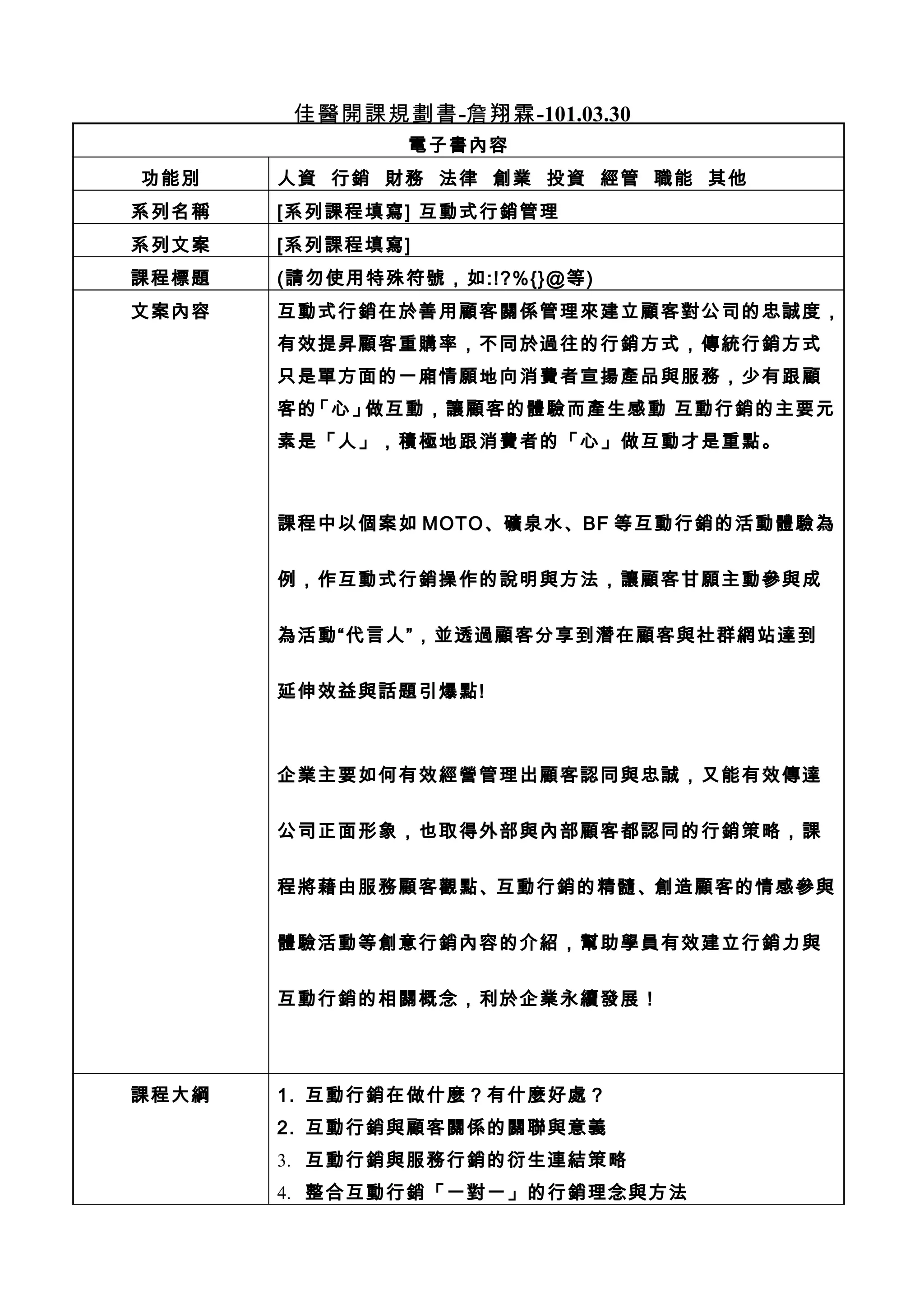 本课程由詹翔霖副教授主讲,主题为互动式行销,强调顾客关系管理如何提升顾客忠诚度和重购率。课程内容涵盖互动行销的基本概念、成功案例分析及与服务行销的关联,旨在帮助学员建立有效的行销策略。通过实际案例和创意行销活动的介绍,课程助力企业在竞争中实现可持续发展。