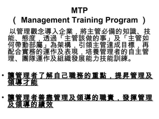 该文档介绍了管理培训计划的架构和目标,强调主管需具备的知识、技能和态度,以提升管理和领导能力。文中详细阐述了管理的基本功能及其在组织中的重要性,包括规划、组织、领导和控制四个核心职能。还探讨了领导力的特质和沟通技巧,强调同理心在建立人际关系中的关键作用。