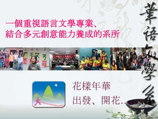 本报告概述了华语文学系的教育目标和课程设计,强调培养对外华语人才与区域文学写作能力。系所拥有丰富的教学资源和多样的学习活动,旨在提高学生的语言和文化素养。报告还指出教师团队的专业背景及其对学生的支持与辅导。