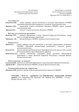 Документ представляет собой программу по геометрии для 10-11 классов общеобразовательных организаций, утвержденную Министерством образования и науки Донецкой народной республики. Программа нацелена на обеспечение базового уровня математической подготовки, развитие логического и пространственного мышления, а также формирование необходимых навыков для дальнейшего обучения. Важное внимание уделяется изучению геометрии как универсального языка науки и техники и включает различные темы, такие как стереометрия, многогранники и объемы тел.