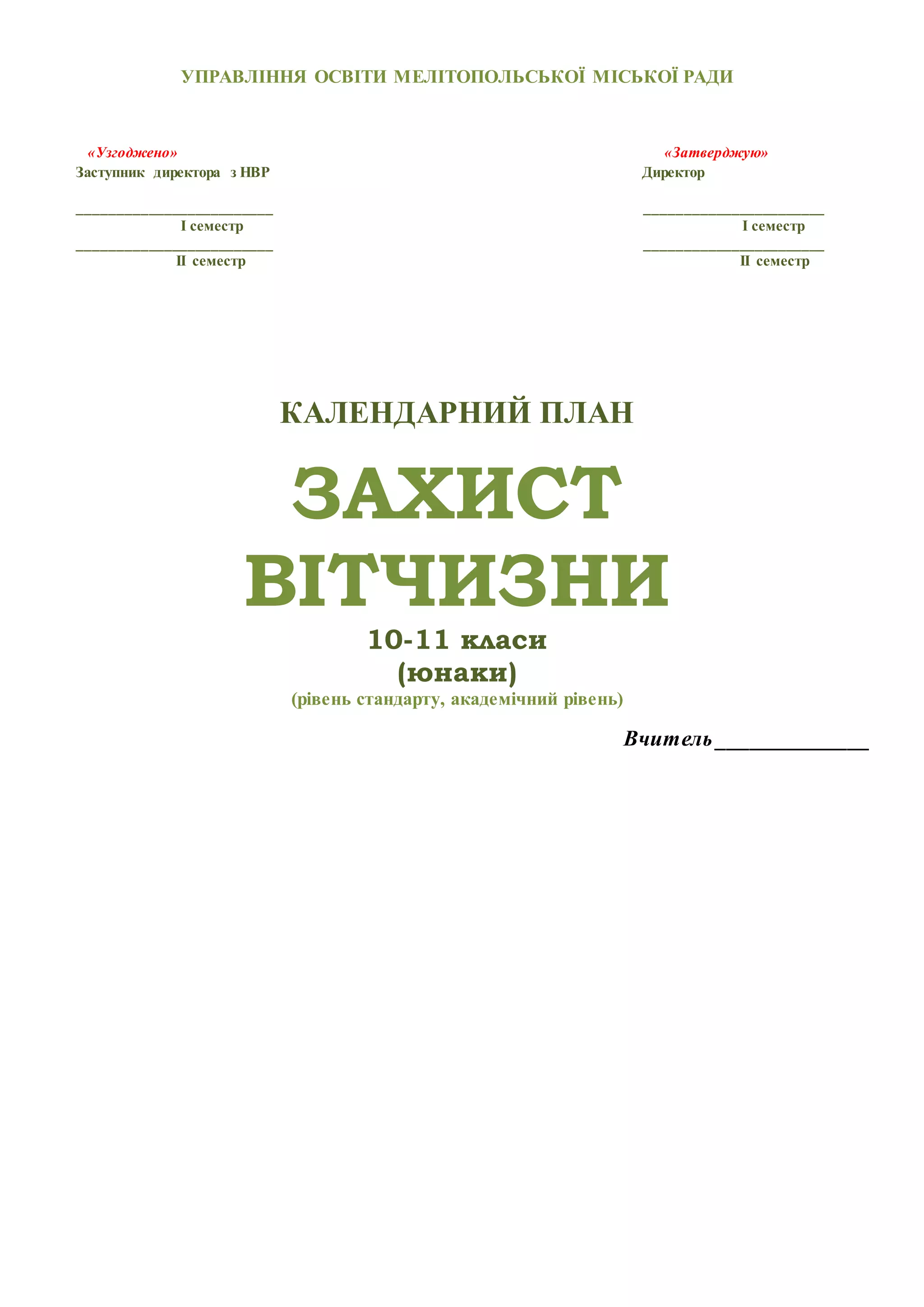 Календарний план. Захист Вітчизни 10-11 класи (юнаки)