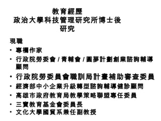 詹翔霖副教授在生涯建築中提供了自己廣泛的教育及專業經歷,強調生命體驗的價值與學習的重要性,並分享許多啟發人生的故事和名言。他的教學理念圍繞著自我成長、夢想實現及面對挑戰的勇氣,鼓勵人們善用每一次經歷,無論成功或失敗。該文檔還強調了讀書和學習的持續重要性,與生命的各個階段息息相關。