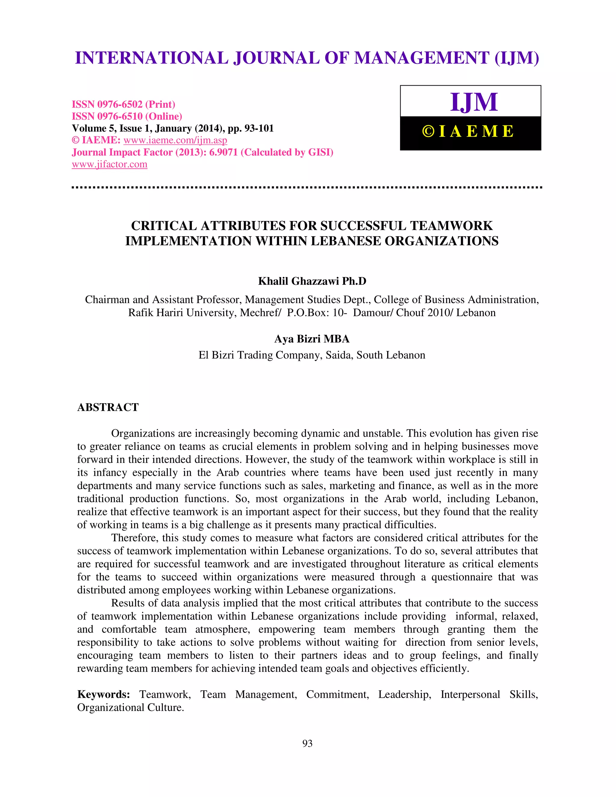 This document summarizes a research study on critical attributes for successful teamwork implementation within Lebanese organizations. The study examined five attributes identified in literature as important for effective teamwork: commitment to team success, commitment to leadership, open communication and feedback, interpersonal skills of team members, and organizational culture. A questionnaire was distributed to employees in Lebanese companies to assess the relationship between these attributes and successful teamwork implementation. Data analysis found that providing an informal, relaxed atmosphere and empowering team members were the most critical attributes that contribute to successful teamwork in Lebanese organizations.