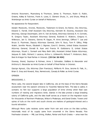 This summarizes a key court case regarding the diversions of water from streams flowing into Mono Lake by Los Angeles. The case brought together California's system of water rights and the public trust doctrine. It determined that the state has authority over navigable waters as part of the public trust, and that water rights are not absolute but subject to reconsideration if diversions harm public trust interests like scenic beauty and ecology. The court said diversions from Mono Lake must be reconsidered to protect public trust values in the lake.