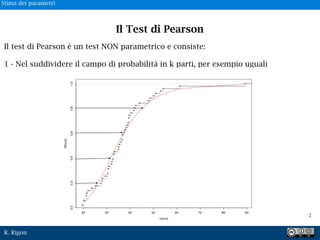 Il documento descrive il test di Pearson come un metodo non parametrico per analizzare le precipitazioni estreme, suddividendo il campo di probabilità in parti e contando i dati in ciascun intervallo. Il processo include la valutazione delle funzioni p[h < h0] e la scelta dei parametri per trovare il valore di x2 più piccolo. Infine, il test viene ripetuto per differenti durate di precipitazione per ottenere linee segnalitrici di possibilità pluviometrica.