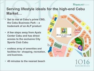 The document outlines the features of ALP Residential Condominiums in Cebu, located in a prime area near Ayala Center Cebu, offering high-end amenities and direct access to the City Sports Club Cebu. It describes the various types of residential units, their designs focused on luxury and comfort, and emphasizes the sustainability aspects through natural ventilation and efficient systems. Construction updates and sales statistics indicate significant progress and market interest in these exclusive residences.