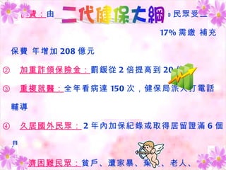 二代健保于101年7月1日实施,保费由5.17%降至4.91%,预计83%民众受益,只有17%需缴补充保费。新法还加强了对保健滥用的打击,加重保险金欺诈的罚款,并对重复就医情况进行辅导。经济困难的群体在二代健保中将享有保护,确保他们的就医权益。