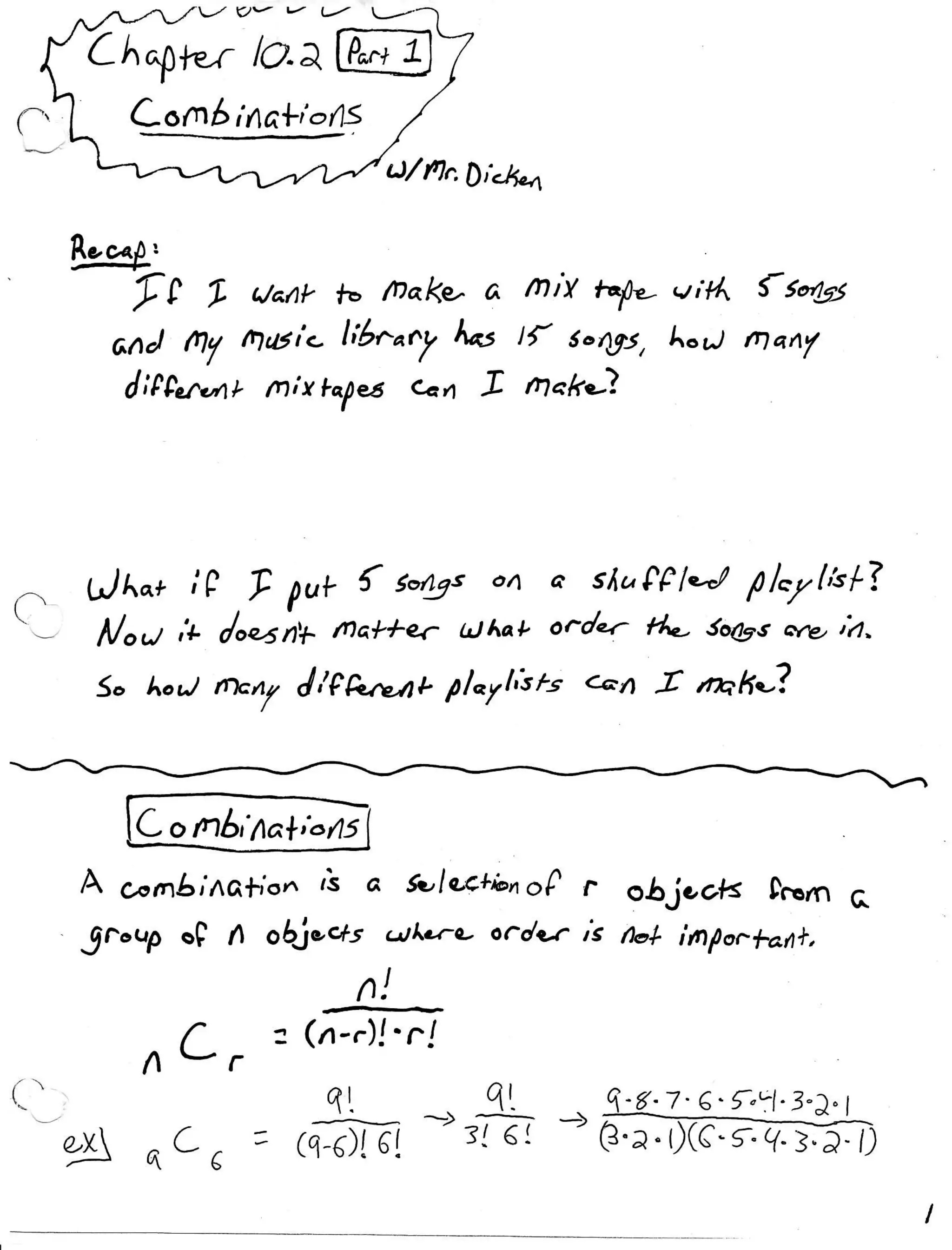 The document discusses combinations and permutations. It provides examples of how to calculate the number of possible combinations and permutations of objects in a set or group, including cards in a deck. Formulas are given for combinations and permutations, and examples are worked through step-by-step to demonstrate calculating combinations and permutations in different scenarios.