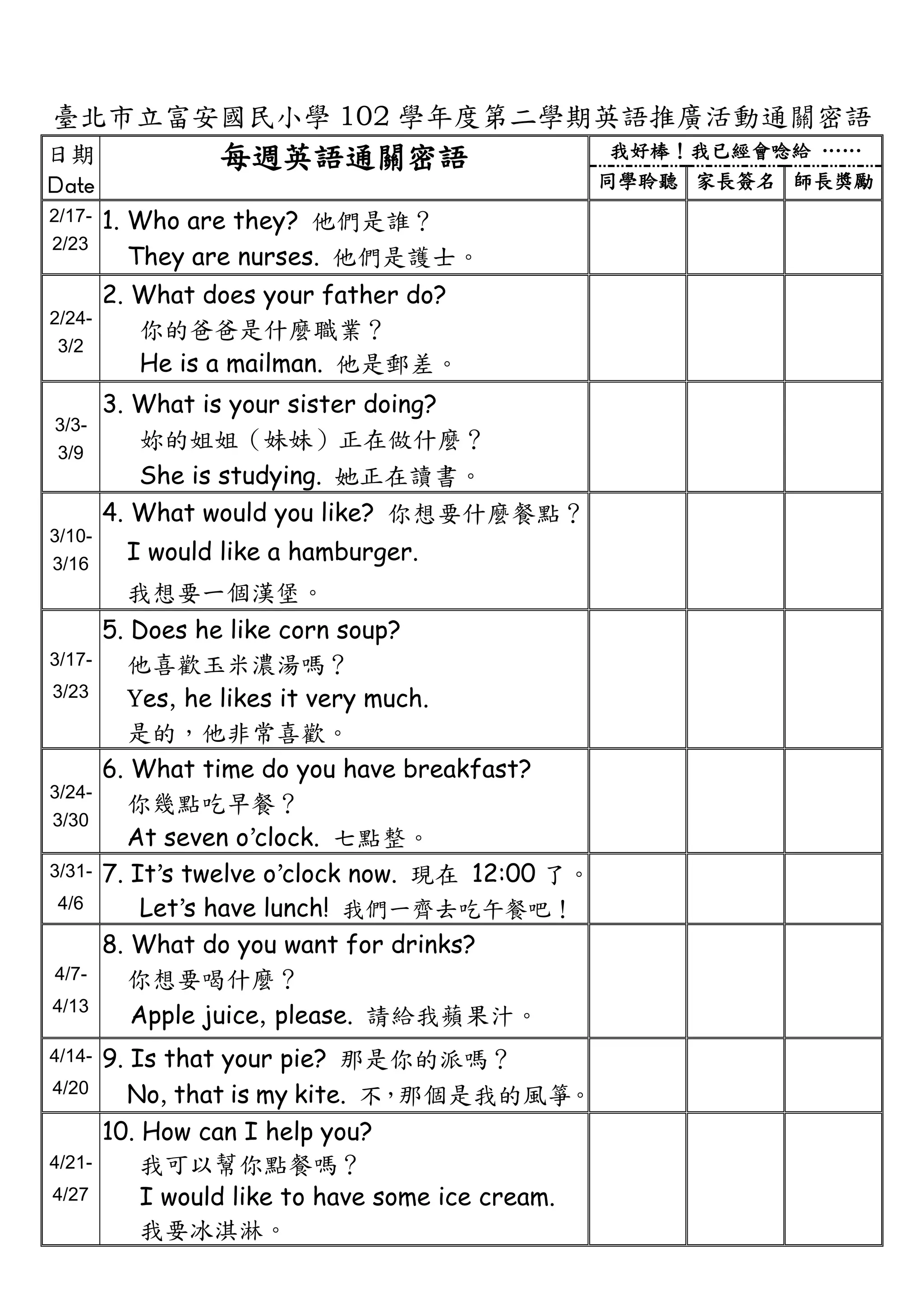 臺北市立富安國民小學 102 學年度第二學期英語推廣活動通關密語