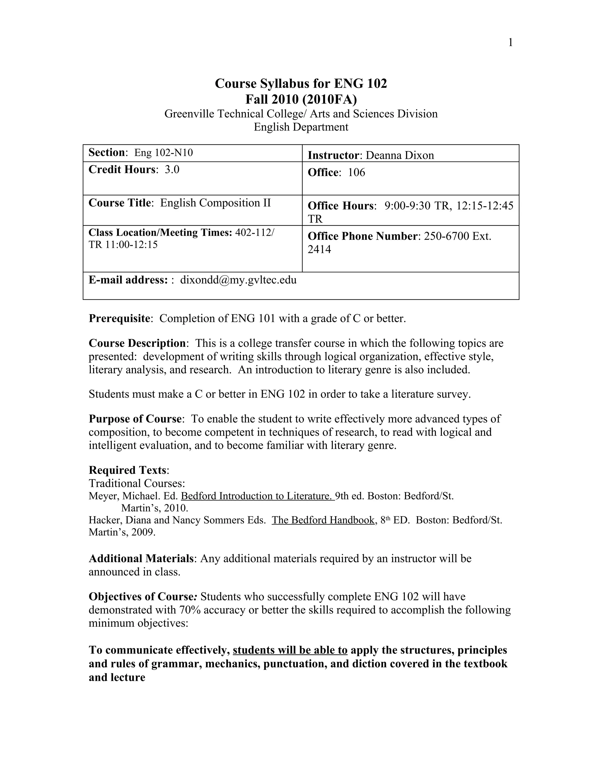 This document provides the course syllabus for English Composition II (ENG 102) taught in the fall of 2010 at Greenville Technical College. The key details include: