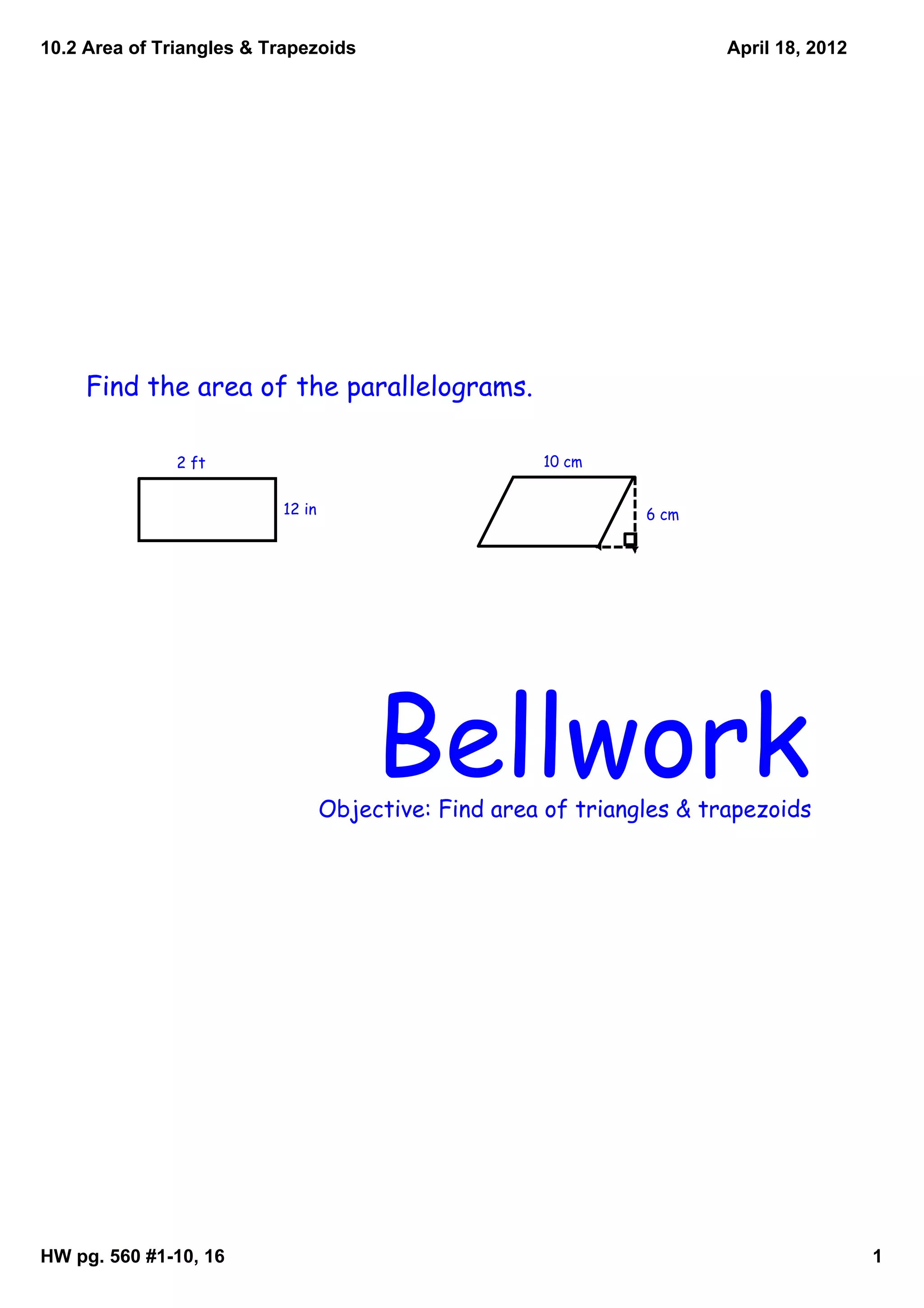 The document is a lesson plan on calculating the area of triangles and trapezoids. It provides the formulas for finding the area of triangles using 1/2 base times height, and the area of trapezoids using 1/2 times the height times the sum of the two bases. Examples are given of finding the area of various triangles and trapezoids. As homework, students are assigned problems 1-10 and 16 on page 560 to practice these area calculations.