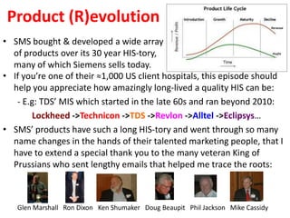 This document provides a summary of the evolution of products developed and sold by Siemens over several decades, beginning with mainframe systems in the 1960s and shared systems in the 1970s. Key products discussed include the SHAS patient accounting system, Eagle billing system, Independence inhouse system, and Invision mainframe system. The document traces how these products changed names and were developed over time, with some like RCM and Soarian still in use today. It previews that next week's discussion will cover mini and micro computer-based products from the 1980s and 1990s.