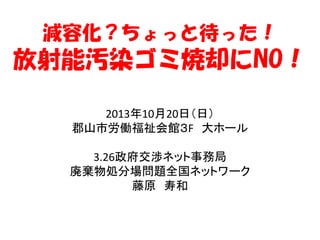 減容化?ちょっと待った! 放射能汚染ゴミ焼却にNO! 2013年10月20日(日) 郡山市労働福祉会館3F 大ホール 3.26政府交渉ネット事務局 廃棄物処分場問題全国ネットワーク 藤原 寿和