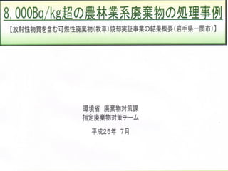 一定濃度とは何か 【環境省】 放射性物質汚染対処特措法では、一定濃度(1キロ グラム当たり8,000ベクレル)を超える放射性物質を 含み、環境大臣が指定したものが指定廃棄物 指定廃棄物の種類 【環境省】 ①焼却灰 ②下水汚泥 ③浄水発生土 ④農林業系副産物(稲わら) ⑤農林業系副産物(堆肥) ⑥その他