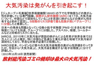 大気汚染は発がんを引き起こす! 【ジュネーブ=石黒穣】世界保健機関(WHO)の下で化学物質などの発がん 性を評価している専門組織、国際がん研究機関(IARC)は17日、大気汚染 について、中国などで深刻化していることを念頭に肺がんなどの発がん性を 有すると初めて認定し、5段階のリスク評価で最も危険が高い「グループ1」 に分類したと発表した。 日本への飛来も問題となっている微小粒子状物質(PM2・5)を含む粒子状 物質についても別途、グループ1に分類した。アスベスト、喫煙、コールター ルなどと同等のリスクに当たる。 IARCは、2010年に大気汚染が原因の肺がんによる死者が世界全体で22 万人に上ったと推計。特に中国など急速な工業化が進む地域で大気汚染が 深刻化しており、早急な対策が必要だと指摘した。 IARCは従来、ベンゼンなど個々の大気汚染物質の発がん性評価を行ってき たが、今回から「大気汚染」と、大気汚染を構成する「粒子状物質」に分けて 評価した。 (2013年10月18日 読売新聞) 放射能汚染ゴミの焼却は最大の大気汚染!