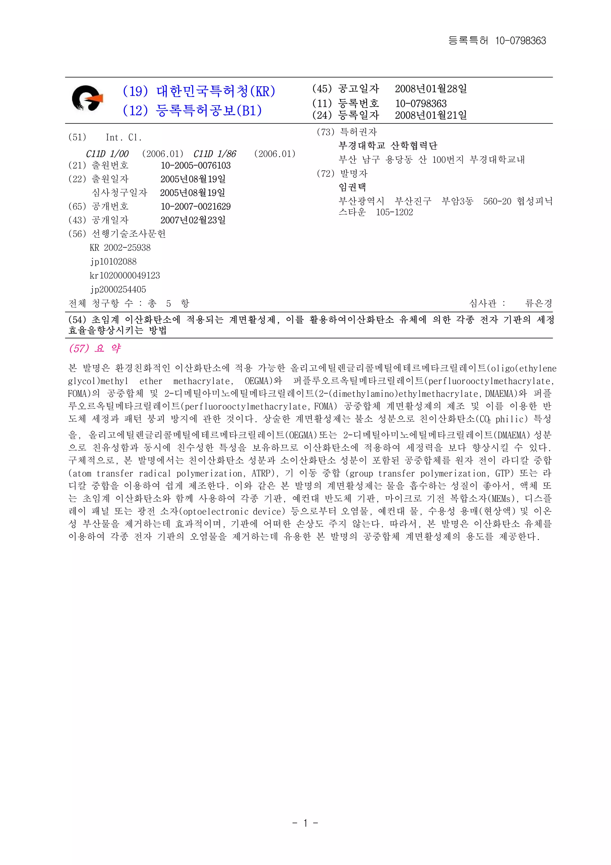 (19) ๋ํ๋ฏผ๊ตญํนํ์ฒญ(KR) (45) ๊ณต๊ณ ์ผ์ 2008๋ 01์28์ผ (11) ๋ฑ๋ก๋ฒํธ 10-0798363 (12) ๋ฑ๋กํนํ๊ณต๋ณด(B1) (24) ๋ฑ๋ก์ผ์ 2008๋ 01์21์ผ (73) ํนํ๊ถ์ (51) Int. Cl. ๋ถ๊ฒฝ๋ํ๊ต ์ฐํํ๋ ฅ๋จ C11D 1/00 (2006.01) C11D 1/86 (2006.01) ๋ถ์ฐ ๋จ๊ตฌ ์ฉ๋น๋ ์ฐ 100๋ฒ์ง ๋ถ๊ฒฝ๋ํ๊ต๋ด (21) ์ถ์๋ฒํธ 10-2005-0076103 (72) ๋ฐ๋ช ์ (22) ์ถ์์ผ์ 2005๋ 08์19์ผ ์๊ถํ ์ฌ์ฌ์ฒญ๊ตฌ์ผ์ 2005๋ 08์19์ผ ๋ถ์ฐ๊ด์ญ์ ๋ถ์ฐ์ง๊ตฌ ๋ถ์3๋ 560-20 ํ์ฑํผ๋ (65) ๊ณต๊ฐ๋ฒํธ 10-2007-0021629 ์คํ์ด 105-1202 (43) ๊ณต๊ฐ์ผ์ 2007๋ 02์23์ผ (56) ์ ํ๊ธฐ์ ์กฐ์ฌ๋ฌธํ KR 2002-25938 jp10102088 kr1020000049123 jp2000254405 ์ ์ฒด ์ฒญ๊ตฌํญ ์ : ์ด 5 ํญ ์ฌ์ฌ๊ด : ๋ฅ์๊ฒฝ (54) ์ด์๊ณ ์ด์ฐํํ์์ ์ ์ฉ๋๋ ๊ณ๋ฉดํ์ฑ์ , ์ด๋ฅผ ํ์ฉํ์ฌ์ด์ฐํํ์ ์ ์ฒด์ ์ํ ๊ฐ์ข ์ ์ ๊ธฐํ์ ์ธ์ ํจ์จ์ํฅ์์ํค๋ ๋ฐฉ๋ฒ (57) ์ ์ฝ ๋ณธ ๋ฐ๋ช ์ ํ๊ฒฝ์นํ์ ์ธ ์ด์ฐํํ์์ ์ ์ฉ ๊ฐ๋ฅํ ์ฌ๋ฆฌ๊ณ ์ํธ๋ ๊ธ๋ฆฌ์ฝ๋ฉํธ์ํ ๋ฅด๋ฉํํฌ๋ฆด๋ ์ดํธ(oligo(ethylene glycol)methyl ether methacrylate, OEGMA)์ ํผํ๋ฃจ์ค๋ฅด์ฅํธ๋ฉํํฌ๋ฆด๋ ์ดํธ(perfluorooctylmethacrylate, FOMA)์ ๊ณต์คํฉ์ฒด ๋ฐ 2-๋๋ฉํธ์๋ฏธ๋ ธ์ํธ๋ฉํํฌ๋ฆด๋ ์ดํธ(2-(dimethylamino)ethylmethacrylate, DMAEMA)์ ํผํ ๋ฃจ์ค๋ฅด์ฅํธ๋ฉํํฌ๋ฆด๋ ์ดํธ(perfluorooctylmethacrylate, FOMA) ๊ณต์คํฉ์ฒด ๊ณ๋ฉดํ์ฑ์ ์ ์ ์กฐ ๋ฐ ์ด๋ฅผ ์ด์ฉํ ๋ฐ ๋์ฒด ์ธ์ ๊ณผ ํจํด ๋ถ๊ดด ๋ฐฉ์ง์ ๊ดํ ๊ฒ์ด๋ค. ์์ ํ ๊ณ๋ฉดํ์ฑ์ ๋ ๋ถ์ ์ฑ๋ถ์ผ๋ก ์น์ด์ฐํํ์(CO2 philic) ํน์ฑ ์, ์ฌ๋ฆฌ๊ณ ์ํธ๋ ๊ธ๋ฆฌ์ฝ๋ฉํธ์ํ ๋ฅด๋ฉํํฌ๋ฆด๋ ์ดํธ(OEGMA) ๋๋ 2-๋๋ฉํธ์๋ฏธ๋ ธ์ํธ๋ฉํํฌ๋ฆด๋ ์ดํธ(DMAEMA) ์ฑ๋ถ ์ผ๋ก ์น์ ์ฑํจ๊ณผ ๋์์ ์น์์ฑํ ํน์ฑ์ ๋ณด์ ํ๋ฏ๋ก ์ด์ฐํํ์์ ์ ์ฉํ์ฌ ์ธ์ ๋ ฅ์ ๋ณด๋ค ํฅ์์ํฌ ์ ์๋ค. ๊ตฌ์ฒด์ ์ผ๋ก, ๋ณธ ๋ฐ๋ช ์์๋ ์น์ด์ฐํํ์ ์ฑ๋ถ๊ณผ ์์ด์ฐํํ์ ์ฑ๋ถ์ด ํฌํจ๋ ๊ณต์คํฉ์ฒด๋ฅผ ์์ ์ ์ด ๋ผ๋์นผ ์คํฉ (atom transfer radical polymerization, ATRP), ๊ธฐ ์ด๋ ์คํฉ (group transfer polymerization, GTP) ๋๋ ๋ผ ๋์นผ ์คํฉ์ ์ด์ฉํ์ฌ ์ฝ๊ฒ ์ ์กฐํ๋ค. ์ด์ ๊ฐ์ ๋ณธ ๋ฐ๋ช ์ ๊ณ๋ฉดํ์ฑ์ ๋ ๋ฌผ์ ํก์ํ๋ ์ฑ์ง์ด ์ข์์, ์ก์ฒด ๋ ๋ ์ด์๊ณ ์ด์ฐํํ์์ ํจ๊ป ์ฌ์ฉํ์ฌ ๊ฐ์ข ๊ธฐํ, ์์ปจ๋ ๋ฐ๋์ฒด ๊ธฐํ, ๋ง์ดํฌ๋ก ๊ธฐ์ ๋ณตํฉ์์(MEMs), ๋์คํ ๋ ์ด ํจ๋ ๋๋ ๊ด์ ์์(optoelectronic device) ๋ฑ์ผ๋ก๋ถํฐ ์ค์ผ๋ฌผ, ์์ปจ๋ ๋ฌผ, ์์ฉ์ฑ ์ฉ๋งค(ํ์์ก) ๋ฐ ์ด์จ ์ฑ ๋ถ์ฐ๋ฌผ์ ์ ๊ฑฐํ๋๋ฐ ํจ๊ณผ์ ์ด๋ฉฐ, ๊ธฐํ์ ์ด๋ ํ ์์๋ ์ฃผ์ง ์๋๋ค. ๋ฐ๋ผ์, ๋ณธ ๋ฐ๋ช ์ ์ด์ฐํํ์ ์ ์ฒด๋ฅผ ์ด์ฉํ์ฌ ๊ฐ์ข ์ ์ ๊ธฐํ์ ์ค์ผ๋ฌผ์ ์ ๊ฑฐํ๋๋ฐ ์ ์ฉํ ๋ณธ ๋ฐ๋ช ์ ๊ณต์คํฉ์ฒด ๊ณ๋ฉดํ์ฑ์ ์ ์ฉ๋๋ฅผ ์ ๊ณตํ๋ค. - 1 -