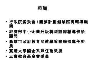 詹翔霖副教授的文件探讨了营销和品牌建设的重要性,强调通过故事行销来增强品牌影响力与消费者忠诚度。它阐述了品牌定位的关键要素及如何借助故事来吸引顾客并促进销售。文件还介绍了成功故事行销的五个关键步骤,以及品牌影响力的构建与持续增长的策略。