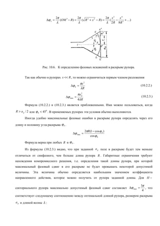Документ обсуждает анализ работы секториального рупора в цилиндрической системе координат, включая формулы для описания компонентов поля и фазовых искажений. Приведены приближенные формулы для определения максимального фазового сдвига, а также зависимость коэффициента направленного действия от параметров рупора. Установлены оптимальные соотношения между длиной рупора и его раскрытием для достижения максимального коэффициента направленного действия.