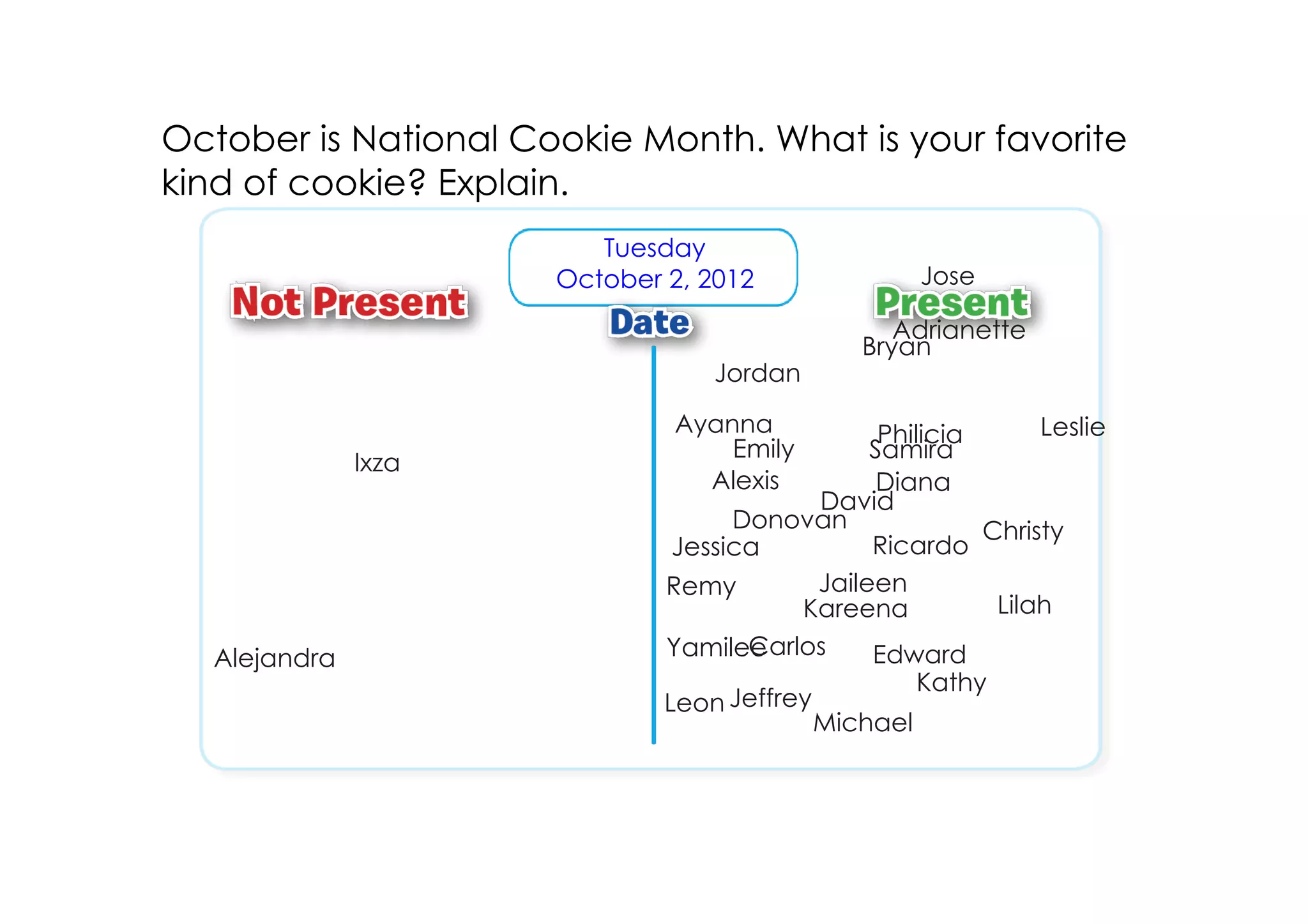 National Cookie Month is celebrated in October. Students were asked to name their favorite type of cookie and explain their choice. The document also included a list of students' names.